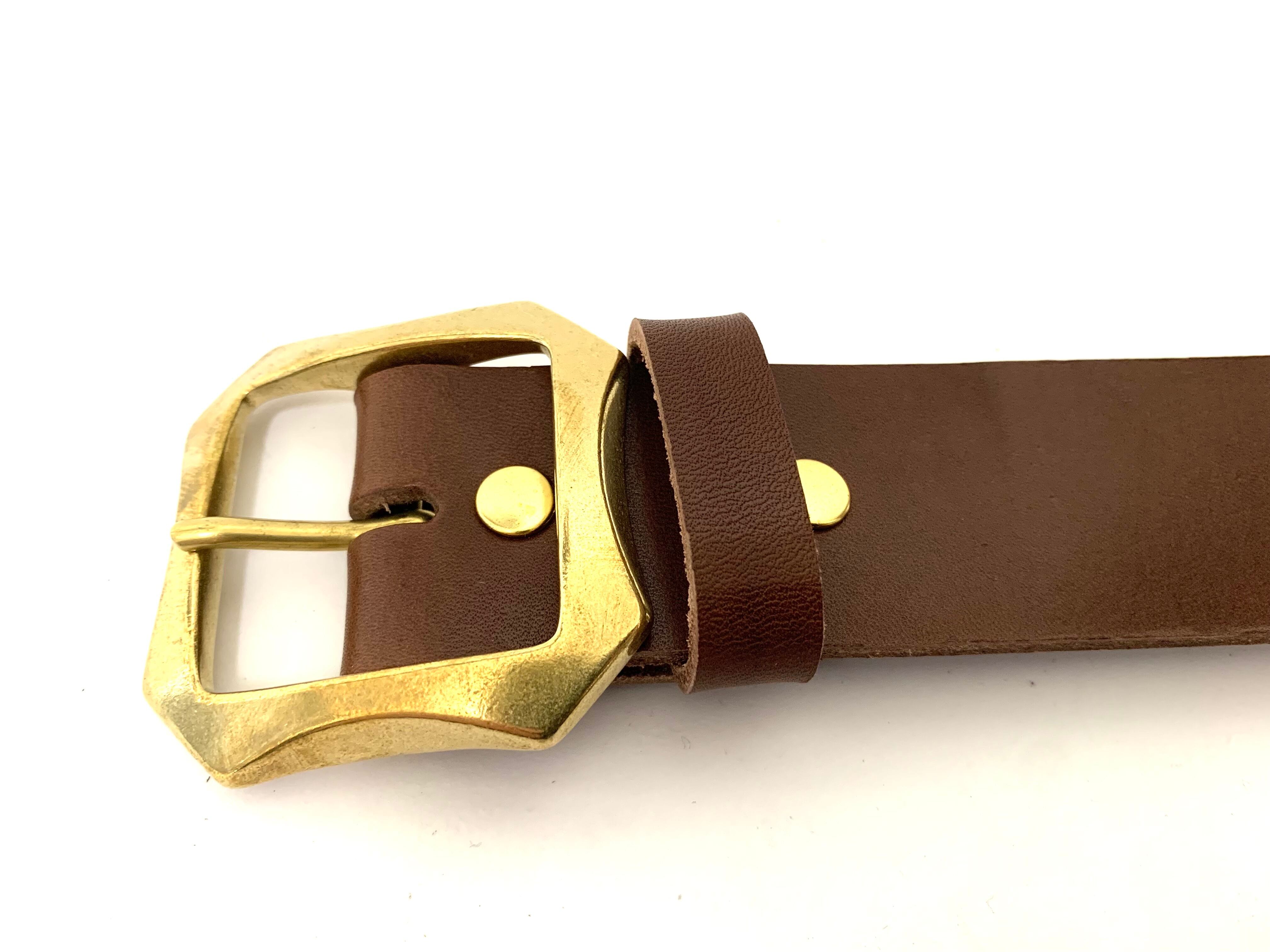 バックルは真鍮素材、人気デザインの八角バックルにカッティングを施したデザインです。